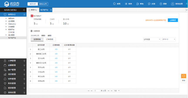 怎么在云立方ERP,查看電子簽賬戶記錄 ? 協同辦公—> 電子簽平臺,統計顯示賬戶余額及已使用數;簽署明細顯示每個版塊的簽署數量;訂單明細顯示購買/贈送記錄。